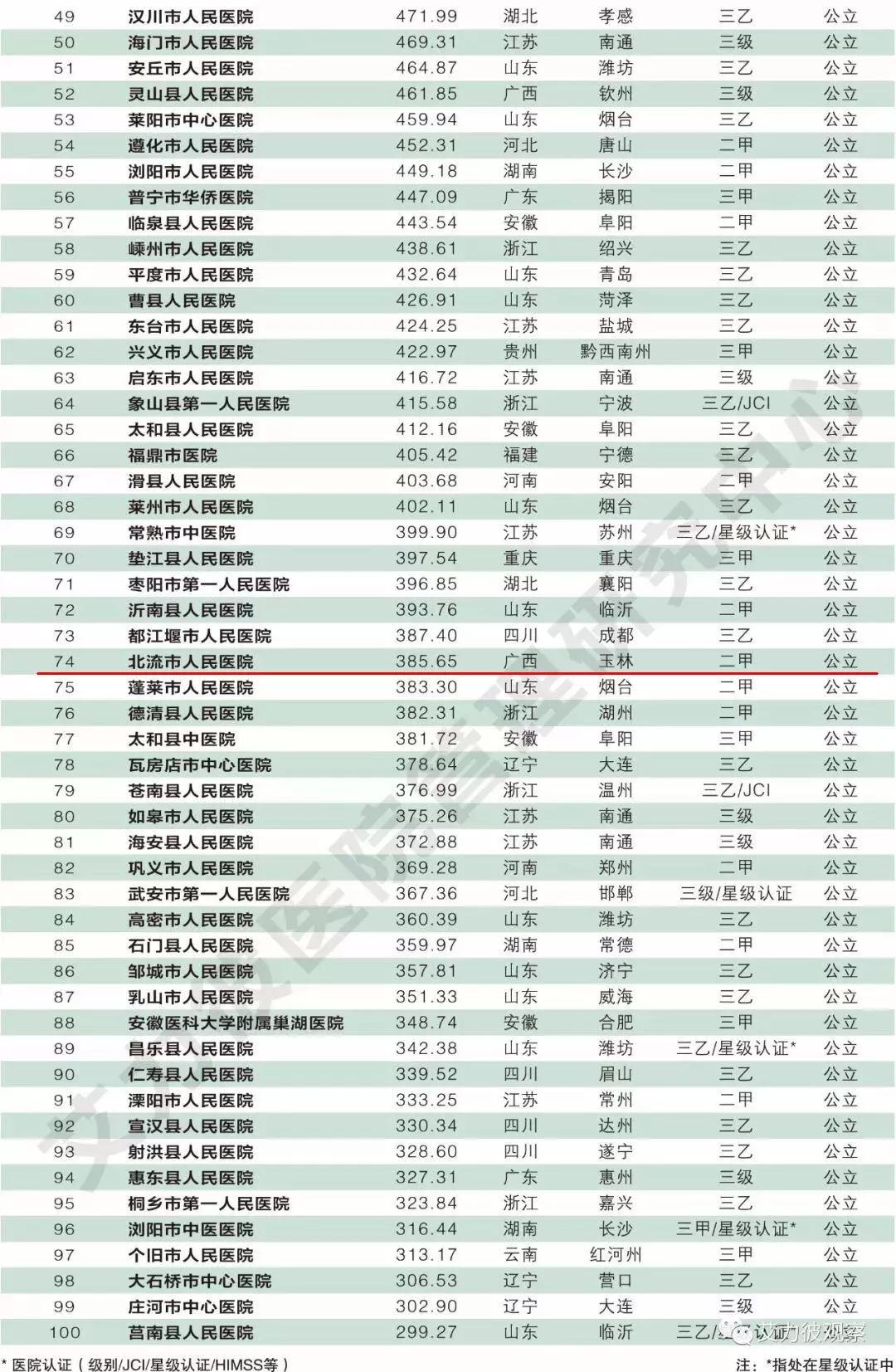 北流市人民医院连续四年挺进中国县级医院百强榜