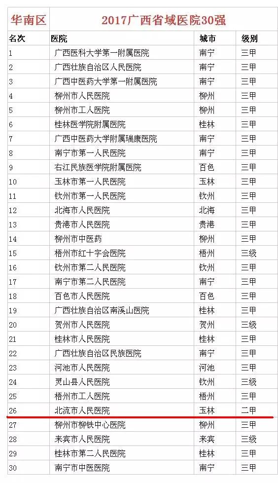 北流市人民医院双榜齐名,连续4年挺进中国县级医院百强榜单;在中国省域医院30强排行榜中,北流市人民医院也挺进广西省域30强,是上榜医院中唯一的一家二级医院。