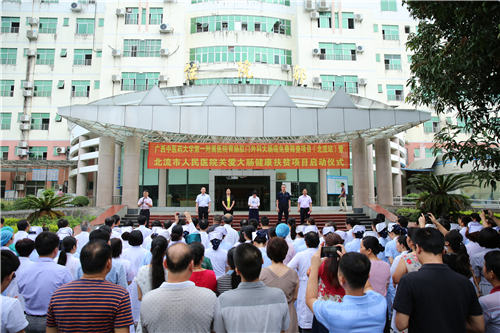 6月4日上午,大肠癌筛查项目暨北流市人民医院“关爱大肠”健康扶贫项目启动仪式在北流市人民医院外科楼门前举行,北流市委常委、宣传部部长陈素贞,北流市政府办副主任陈梅、广西中医药大学第一附属医院副院长钟远鸣、肛肠中心主任庞黎明副主任医师以及医院领导班子、全体临床中层干部约100多人参加了启动仪式,仪式由市卫计局李兆云局长主持。