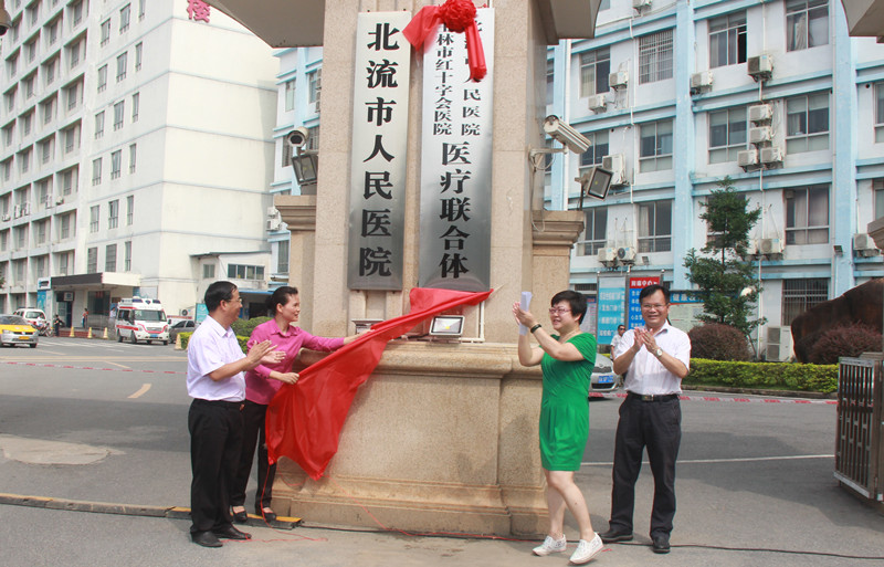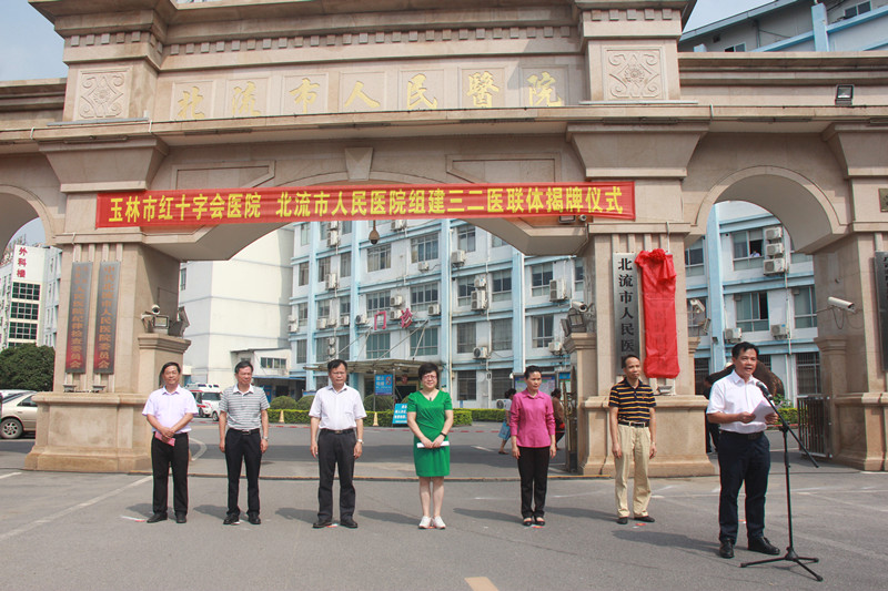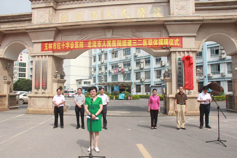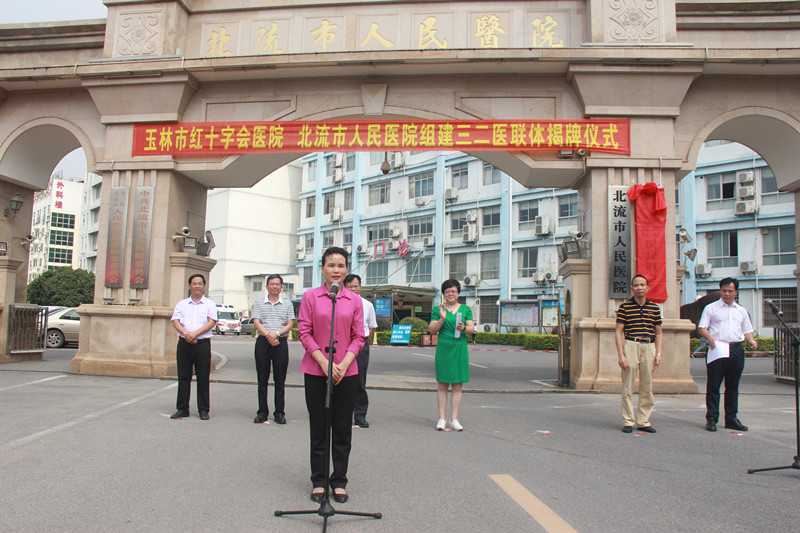 医联体建设是深化医改的重点工作,是推进分级诊疗的抓手,根据自治区人民政府《关于印发广西加快推进医疗联合体建设和发展实施方案的通知》的精神要求,9月7日上午,玉林市红十字会医院和北流市人民医院在北流市举行组建三二紧密型医疗联合体揭牌仪式。玉林市卫计委副主任刘丽珍,北流市常委、宣传部部长、副市长陈素贞,玉林市红十字会医院院长杨昭坚,北流市人民医院院长凌政及两院中层以上领导代表100多人参与了揭牌仪式。仪式由北流市卫计局党组副书记、副局长、党工委书记覃德军主持。