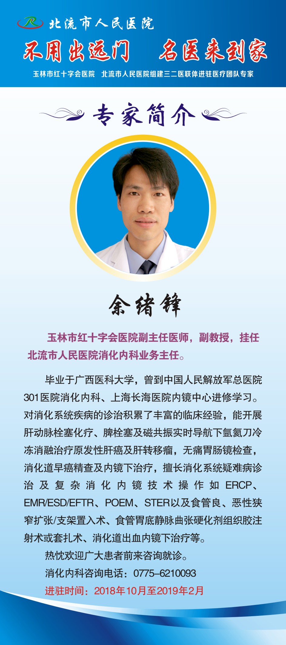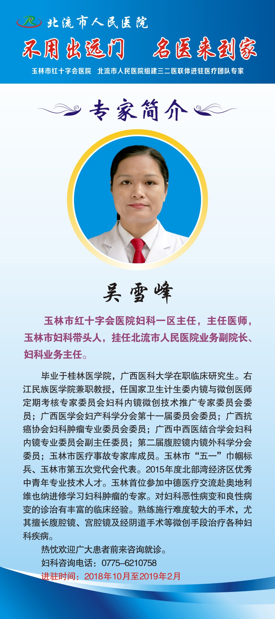 为让北流百姓不用出远门,就能享受到三级医院优质的医疗服务,10月8日,北流市人民医院迎来玉林市红十字会医院首批三二医联体进驻专家,专家团队由妇科吴雪峰主任医师、儿科马晓红副主任医师、消化内科余绪锋副主任医师、放疗科甘赞辉副主任医师、麻醉科周颖副主任医师五位成员组成。驻院时间:2018年10月8日——2019年2月。