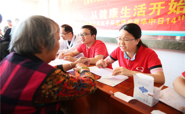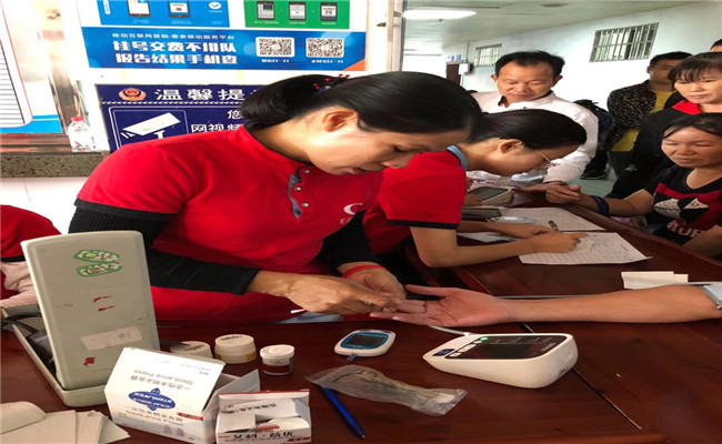 志愿者为群众测量血糖