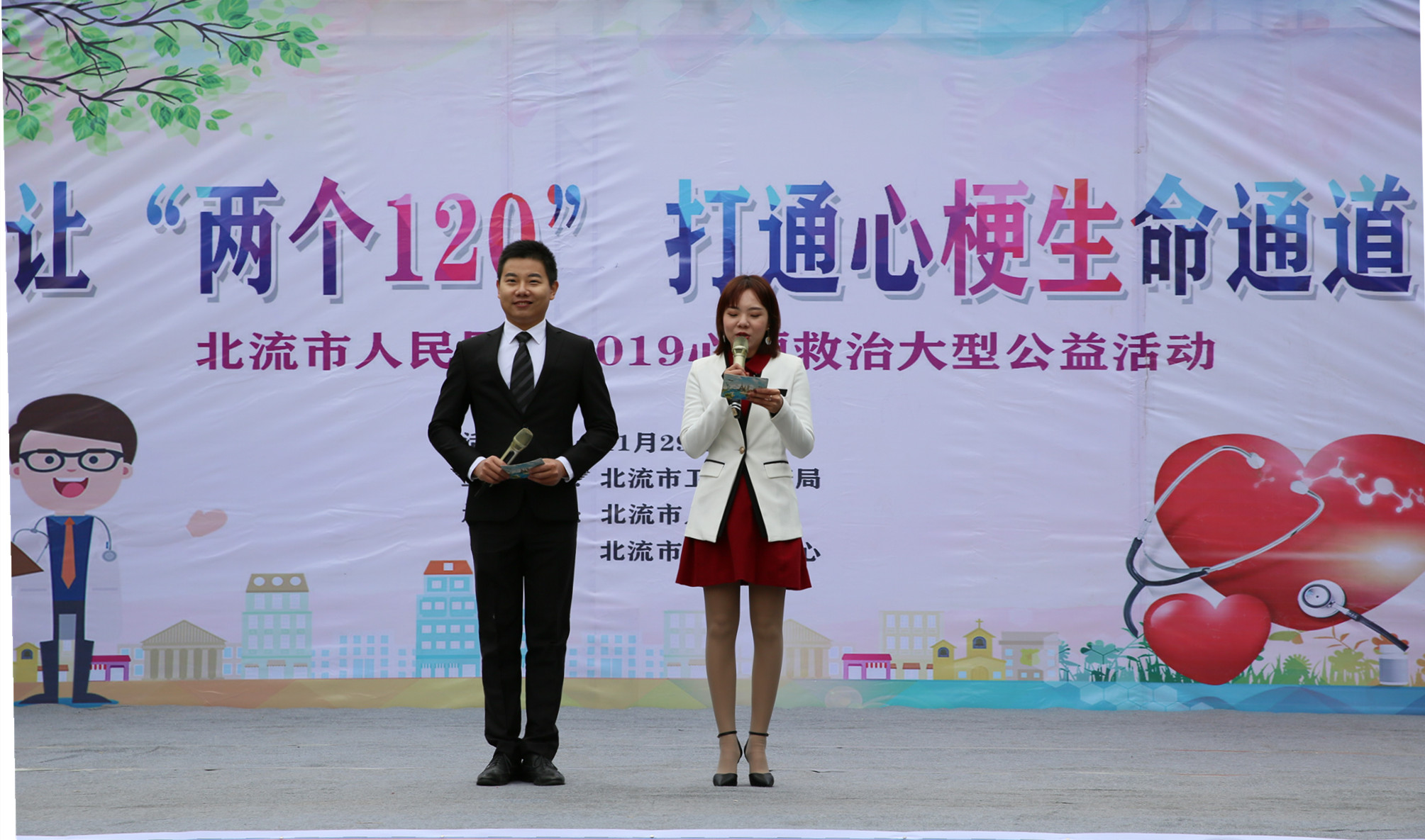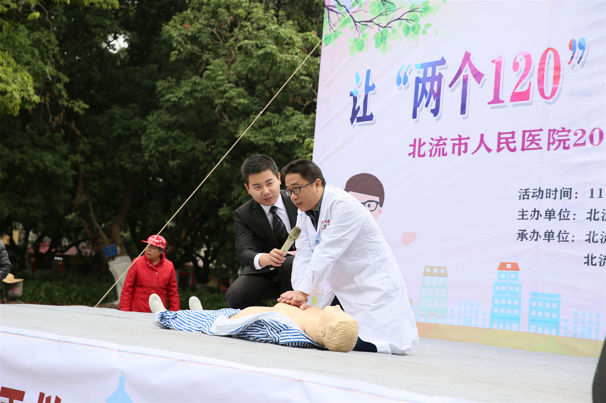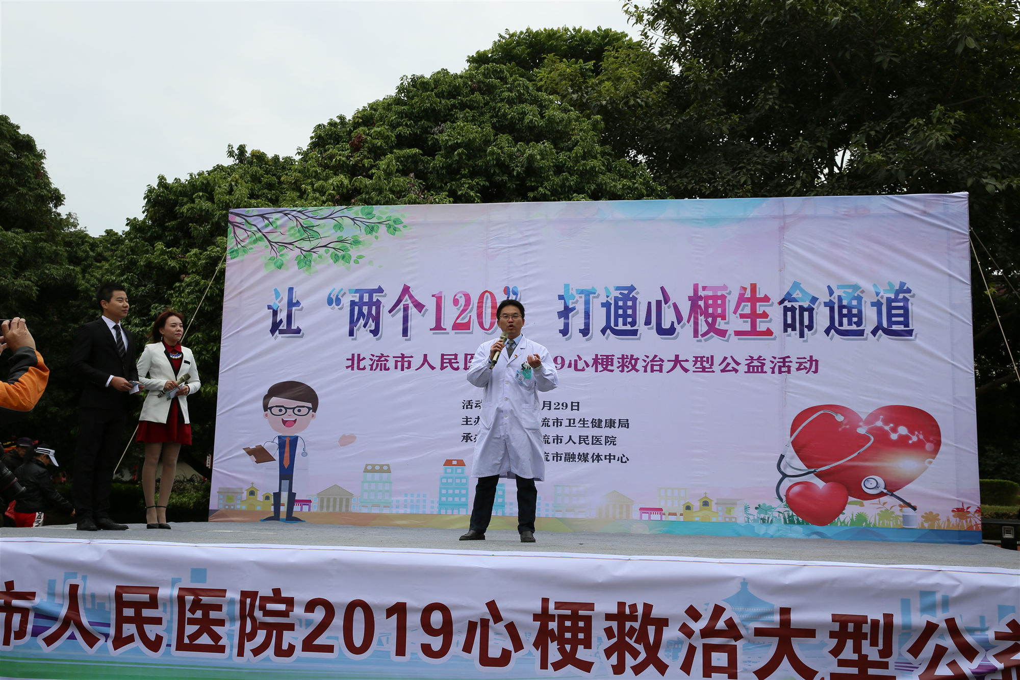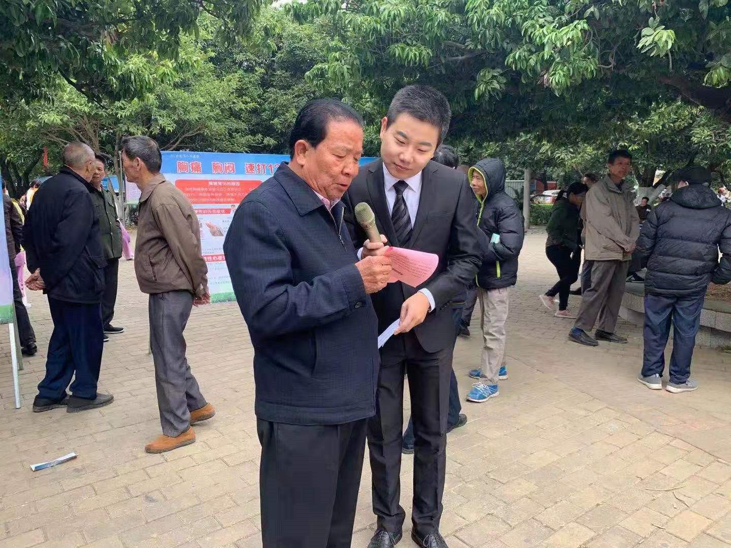为提高公众对心梗严重性与防治重要性的认知,普及急性心肌梗死的规范化救治流程,将“心梗拨打120,胸痛中心快救命”的观念在公众中普及,倡导公众主动维护自身心血管健康,预防为主,尽可能呼吁更多人改善生活方式,包括健康饮食、积极运动、戒烟限酒等,使更多的人免受心血管疾病的困扰,焕发心脏活力,北流市人民医院联合北流市融媒体中心,于11月29日在荔枝公园举办了让“两个120”打通心梗生命通道大型公益宣传义诊活动。