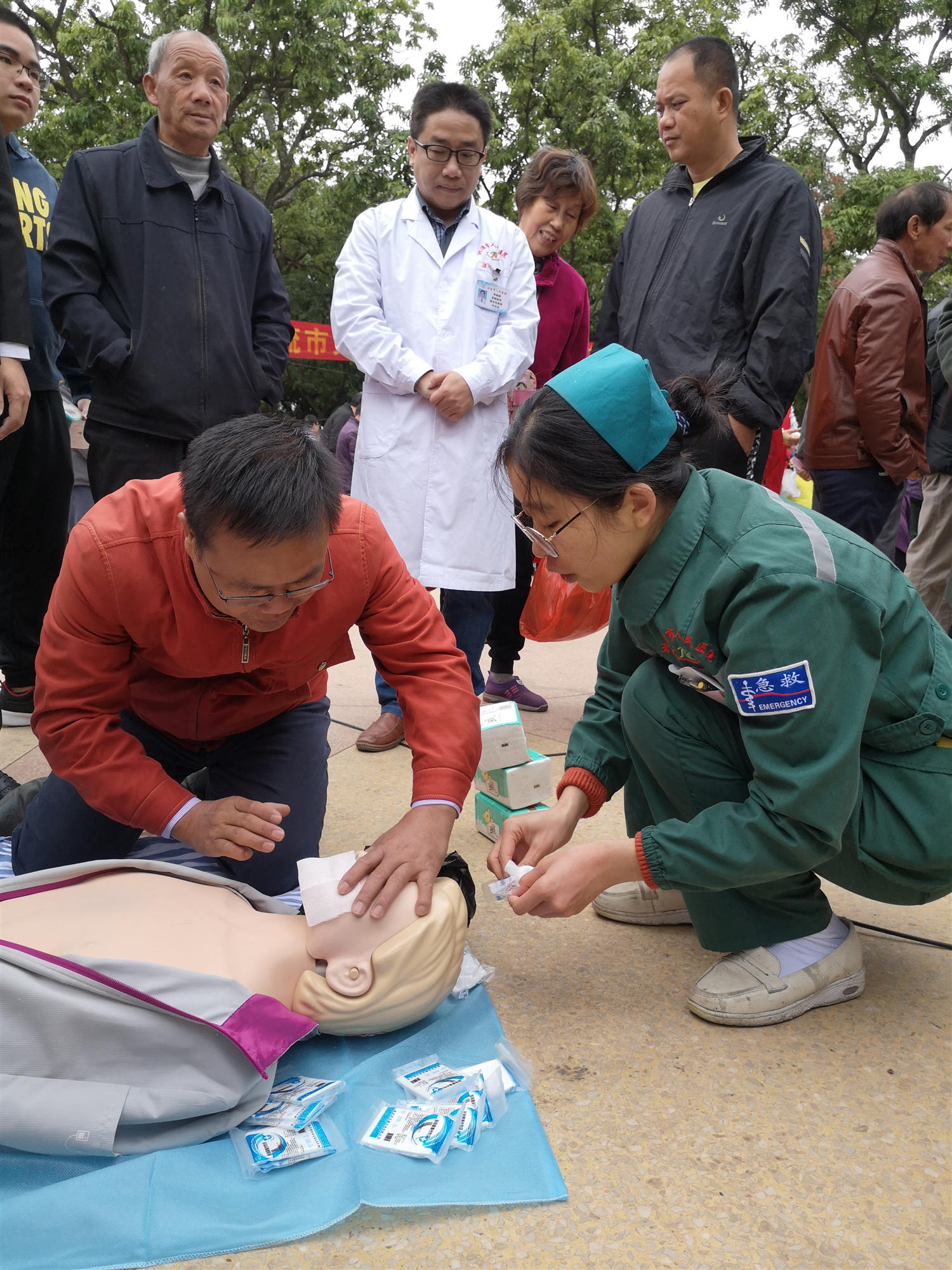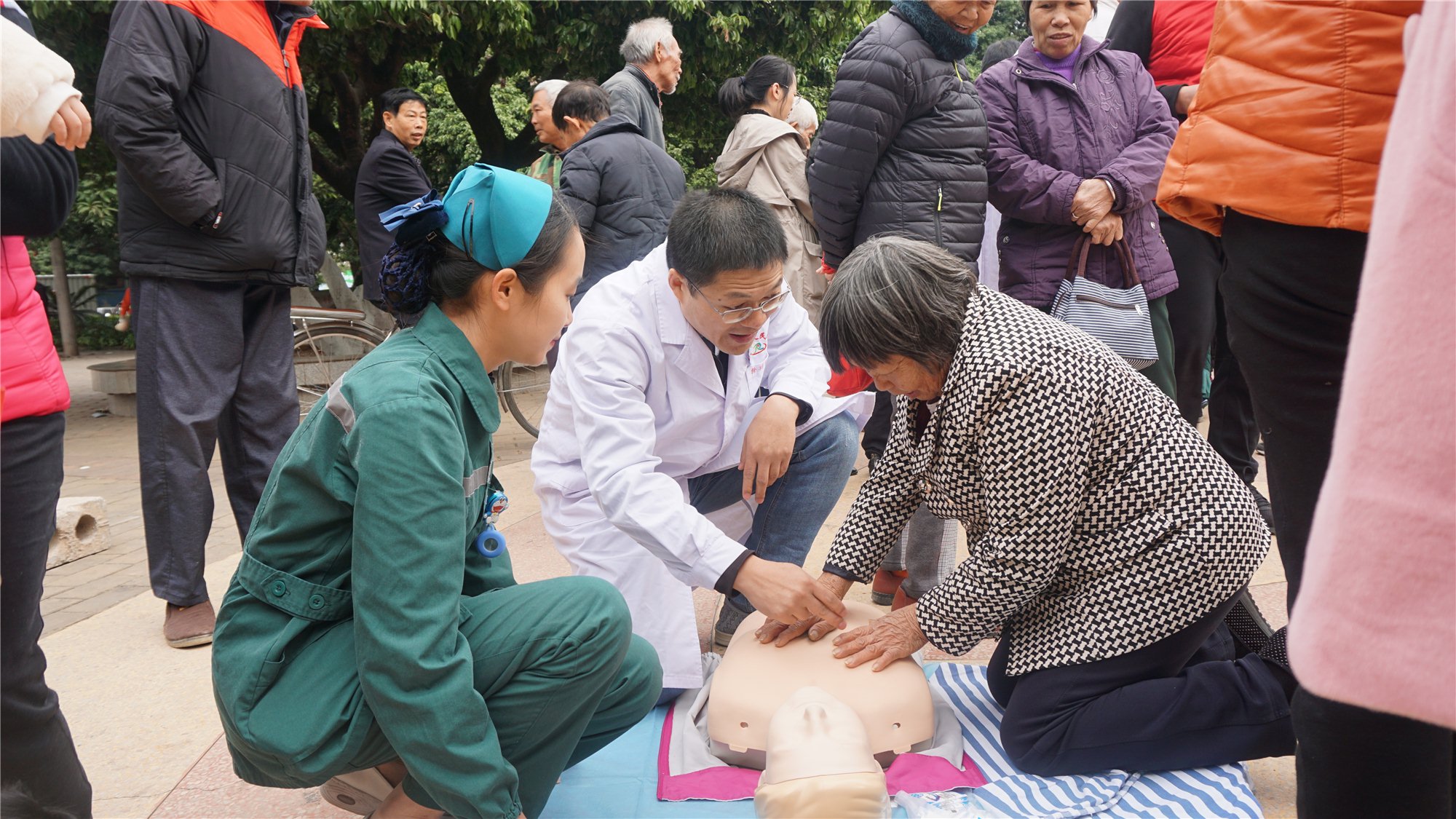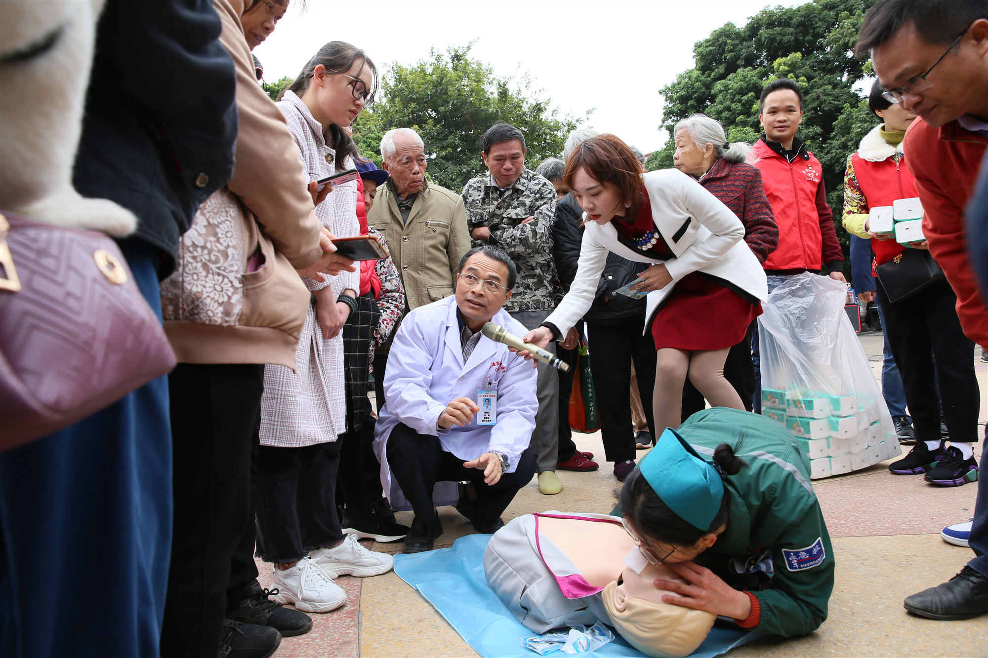 蒋靖生副院长带领专家团队进行了心肺复苏术(CPR)教学演练,现场50多位群众积极参与CPR操作,掌握了CPR的操作要点和步骤,提高了群众的急救意识和水平,亦将整个活动推向了高潮。